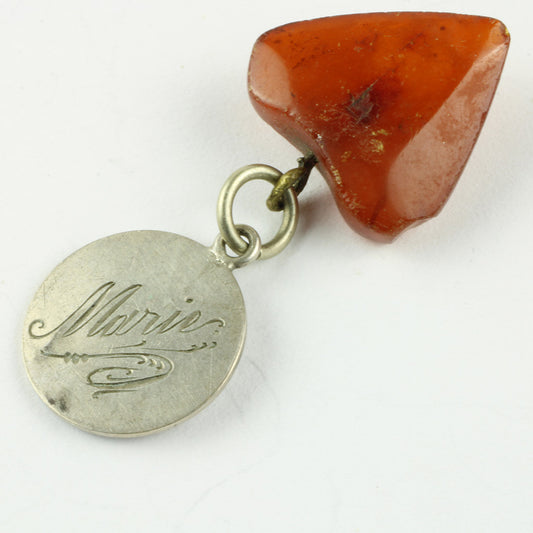 Antik lille charm af ravhjerte og mønt ca. år 1910